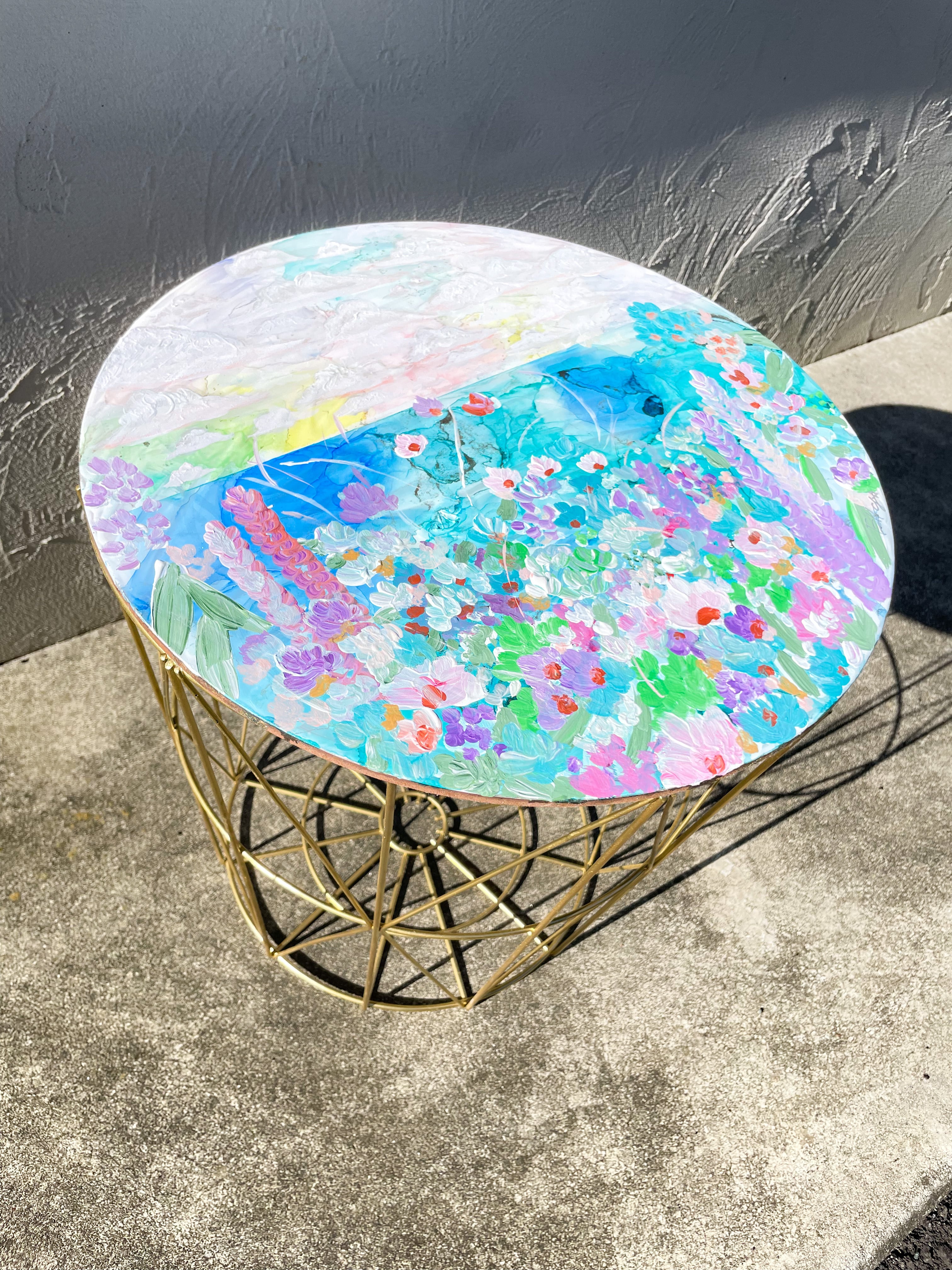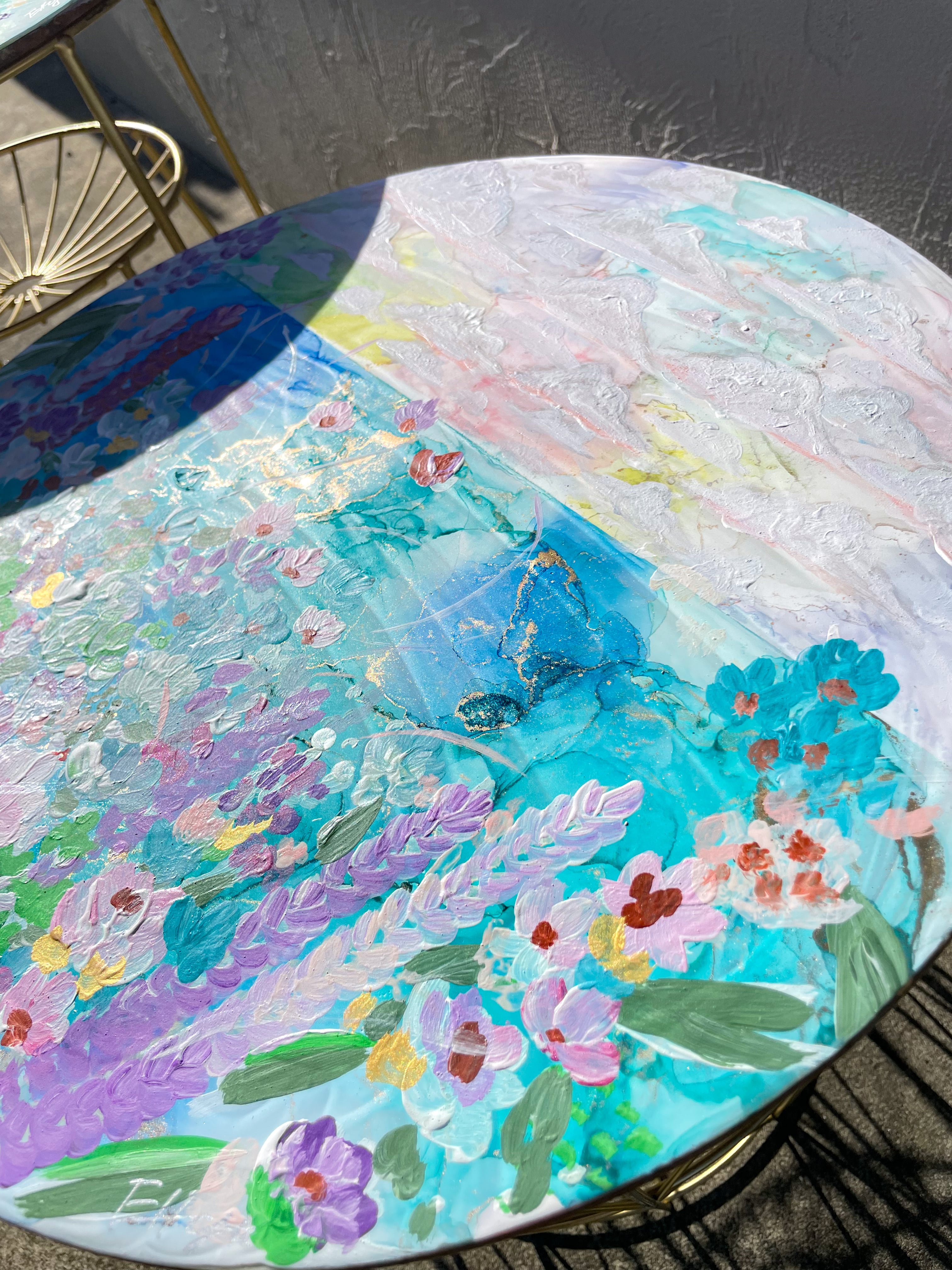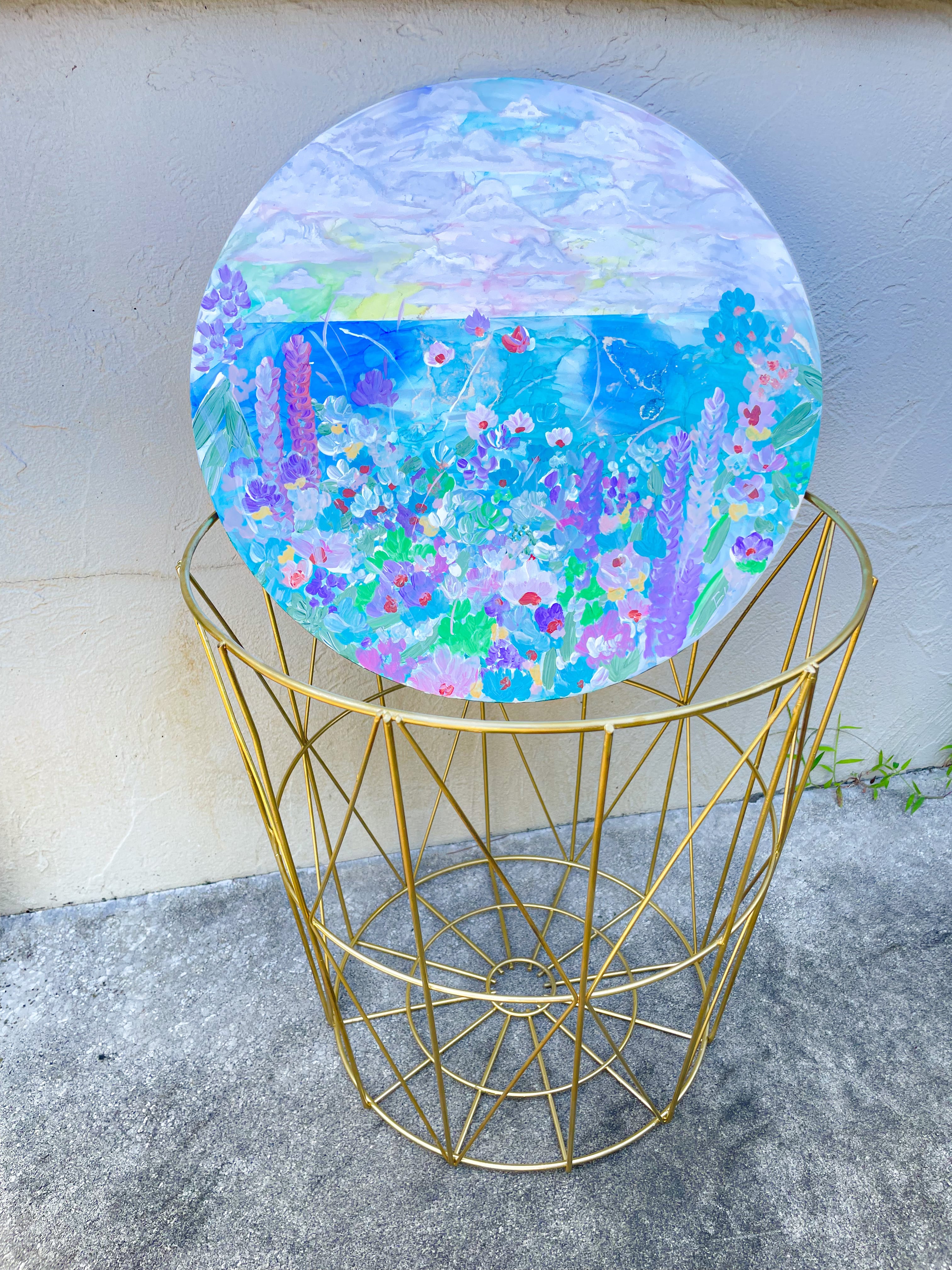 海に続く道に咲き乱れる花畑をアクリル画で描きました。奥行きのある世界観をお楽しみください。
